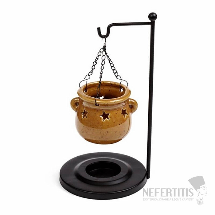Závesná aróma lampa Hnedý kotlík zaujme originálnym dizajnom s kotlíkom zaveseným v stojane, ktorý pôsobí tradične, hrejivo a útulne. Hnedý odtieň evokuje prírodné materiály, stabilitu a pocit bezpečia, vďaka čomu lampa krásne zapadne do prírodne ladeného aj rustikálneho interiéru.