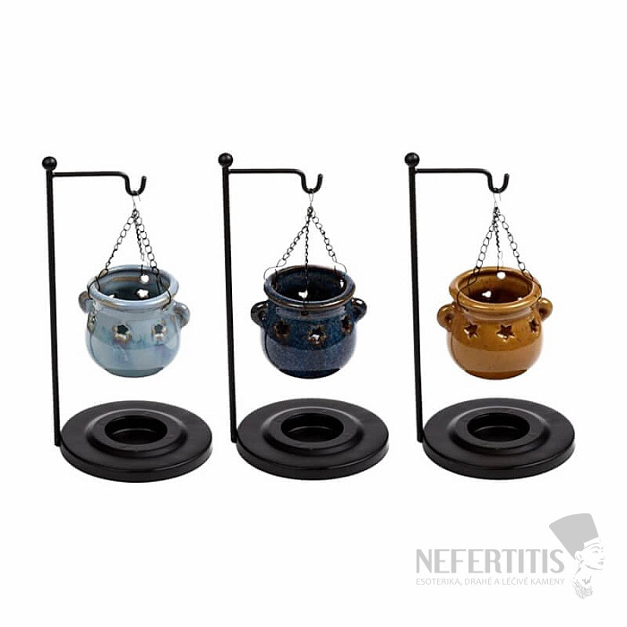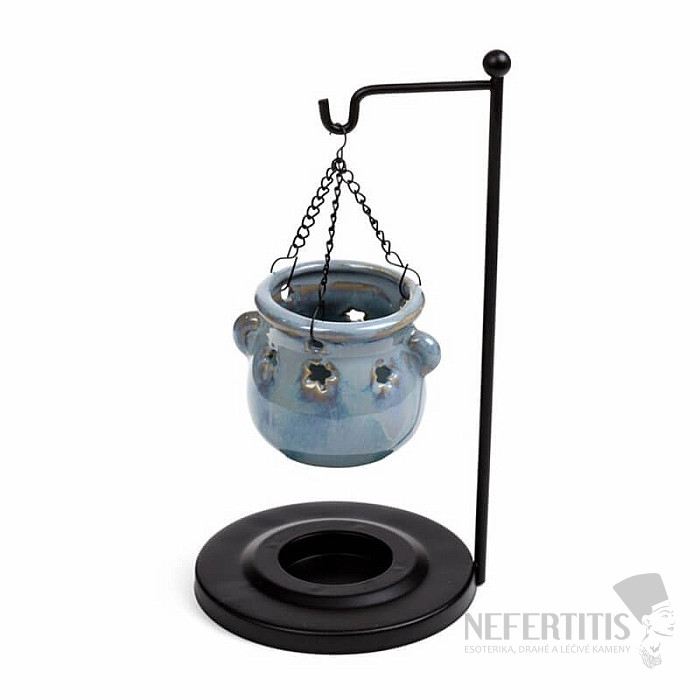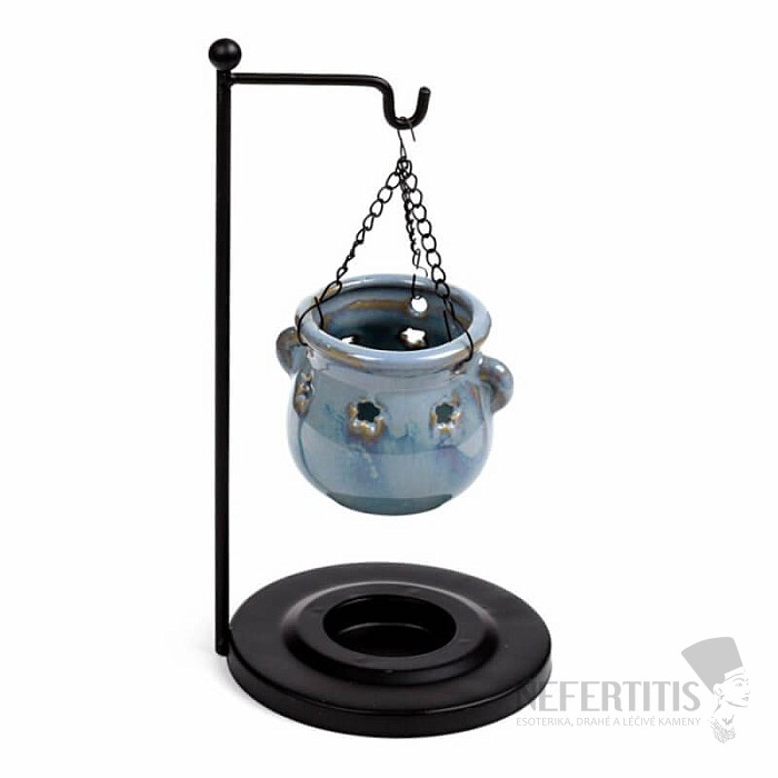 Závesná aróma lampa Modrý kotlík zaujme originálnym dizajnom s kotlíkom zaveseným v stojane, ktorý vytvára jedinečný vizuálny efekt ľahkosti a rovnováhy. Modrý odtieň pôsobí harmonicky, upokojujúcim dojmom a prináša do priestoru pocit sviežosti a pokoja.