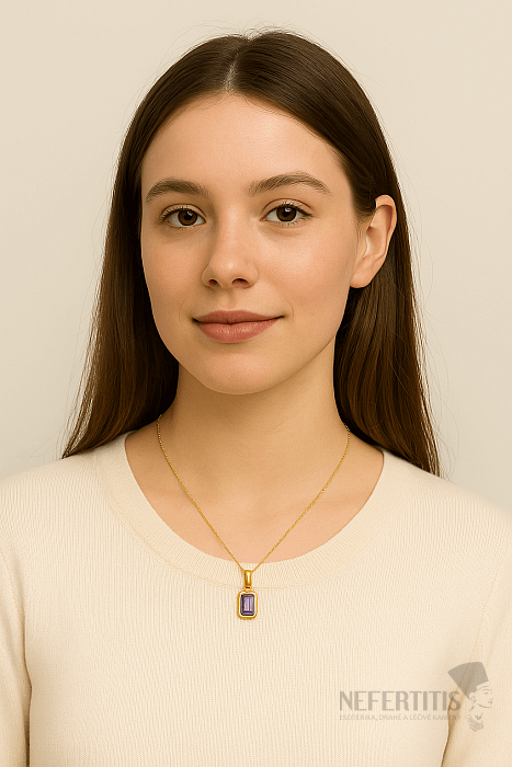 Tento elegantný prívesok z pravého striebra 925/1000 je potiahnutý vrstvou 14k zlata, ktoré mu dodáva teplý, luxusný vzhľad. Hlavným prvkom je prírodný ametyst o veľkosti približne 7 mm, zasadený do obdĺžnikovej obruby a vybrúsený kvalitným emerald (step) brusom , ktorý zvýrazňuje jeho fialové odtiene a priezračnosť.