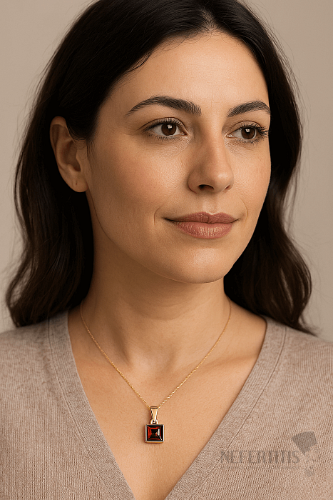 Tento jemný prívesok z kolekcie Concetta je vytvorený z pravého striebra 925/1000 , ktoré je pokryté vrstvou sýteho 14k pozlátenia pre luxusný a trvalo teplý odtieň. Dominantou šperku je prírodný granát o veľkosti približne 6 mm, vybrúsený do elegantného štvorcového tvaru s precíznym facetovým brusom , ktorý podčiarkuje jeho sýtu rubínovú farbu.