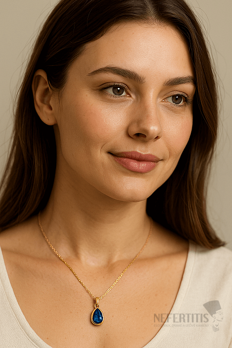Dominantou šperku je prírodný modrý kyanit o veľkosti približne 8 mm , zasadený do hladkej bezkrapňovej obruby. Kameň má kvapkový tvar (pear shape) a precízny facetový brús , ktorý zvýrazňuje jeho charakteristické modré tóny s jemnými svetelnými odleskami. Kyanit patrí medzi výrazné minerálne kamene s osobitým vnútorným leskom a krásnou prírodnou kresbou.