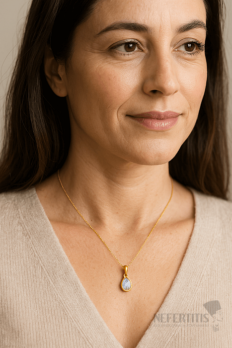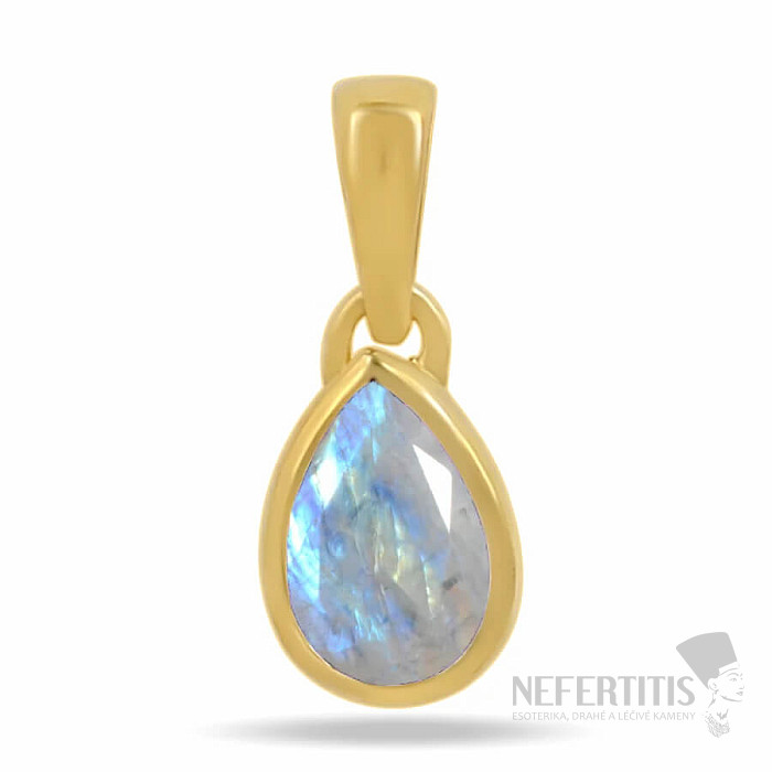 Tento nežný pozlátený prívesok z kolekcie Concetta je vyrobený z pravého striebra 925/1000 , pokrytého vrstvou 14k zlata, ktorá mu dodáva teplý, luxusný odtieň. Dominantou šperku je prírodný dúhový mesačný kameň o veľkosti približne 5 mm, vybrúsený do elegantného tvaru slzy s facetovým brusom . Ten zvýrazňuje jeho charakteristickou hru farieb - jemné modré, biele a dúhové odlesky, vďaka ktorým pôsobí klenot jedinečne a naživo.