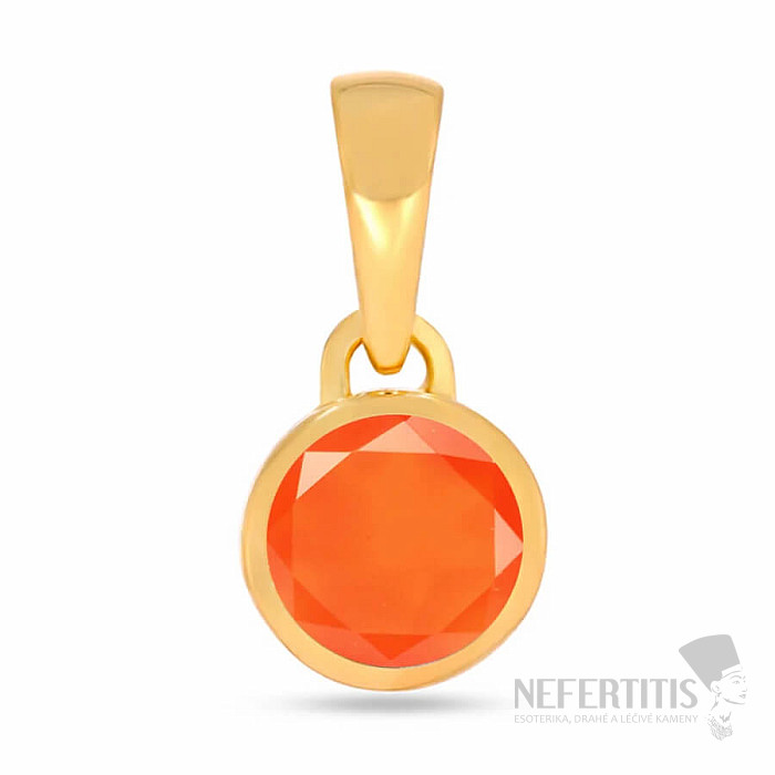 Dominantou šperku je prírodný brúsený kameň karneol s priemerom 6 mm , zasadený do precízne spracovaného pozláteného lôžka, ktoré zvýrazňuje jeho sýtu oranžovo-červenú farbu. Prívesok váži iba 0,5 g , je teda veľmi ľahký, pohodlný a vhodný na každodenné nosenie.