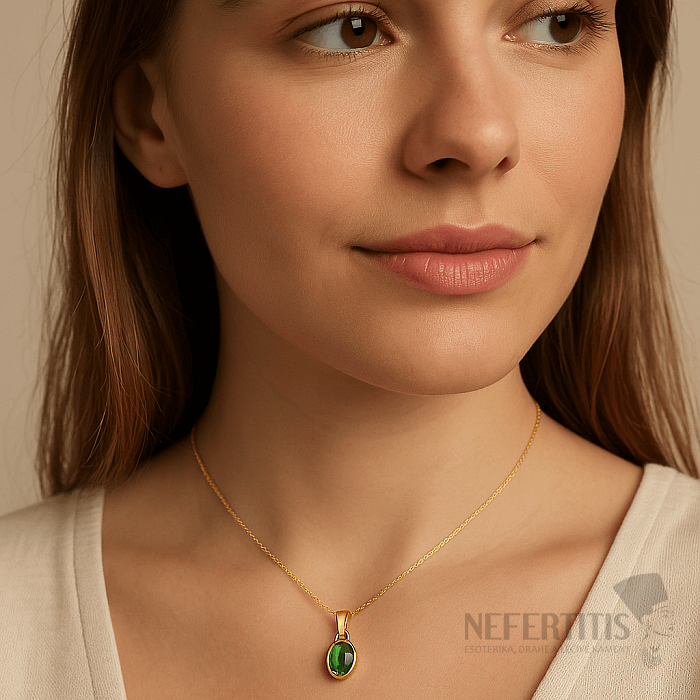 Dominantou prívesku je prírodný brúsený zelený kyanit o veľkosti cca 8 mm , zasadený v precízne vyhotovenej oválnej obrube. Tento kameň je známy svojimi fascinujúcimi zelenými odtieňmi aj jemnými svetelnými odleskami, ktoré vyniknú pri každom pohybe.