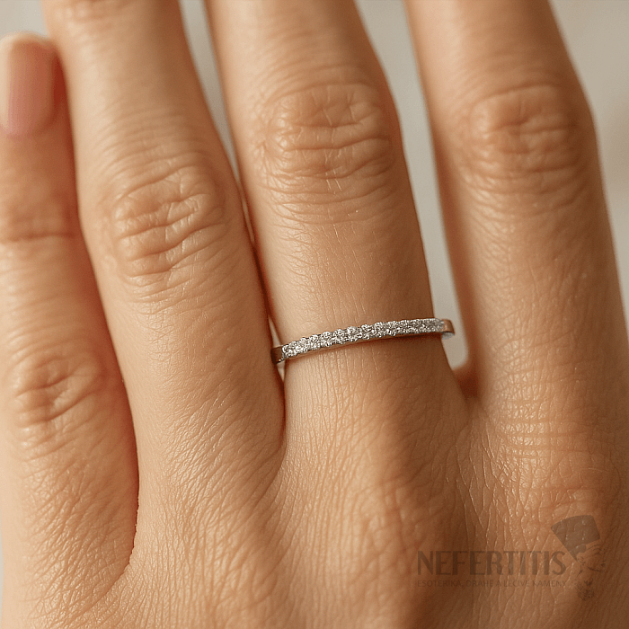 Tento model patrí medzi obľúbené half eternity prstene , teda prstene večnosti , ktoré majú kamene zasadené iba na prednej časti obvodu. Symbolizujú trvalé puto, lásku a harmóniu , a pritom poskytujú pohodlné nosenie každý deň. S hmotnosťou 0,92 g je prsteň ľahký, elegantný a dokonale padne aj pri vrstvení s inými prsteňmi.