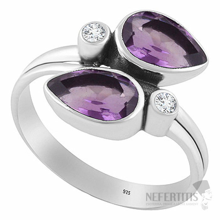 Dominantou prsteňa sú dva výrazné kamene prírodného ametystu o veľkosti cca 8 mm, vybrúsené do pretiahnutého tvaru markíza (marquise) . Kamene sú opatrené precíznym fazetovým brusom , ktorý zvýrazňuje ich ligot a hĺbku typickej fialovej farby.