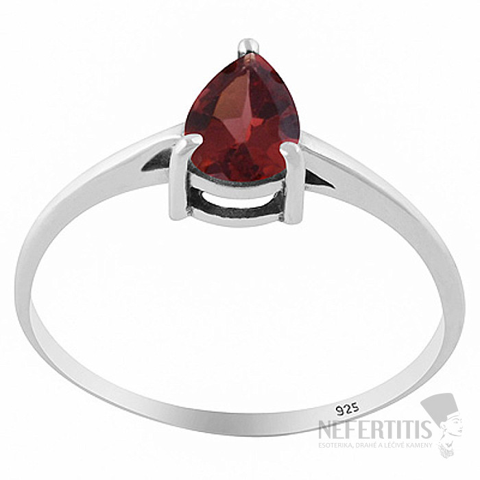 Dominantou prsteňa je prírodný červený granát o veľkosti približne 7 mm, vybrúsený do tvaru kvapky (pear) s precíznym fazetovým brusom , ktorý zvýrazňuje jeho hĺbku, lesk a intenzívnu farbu.