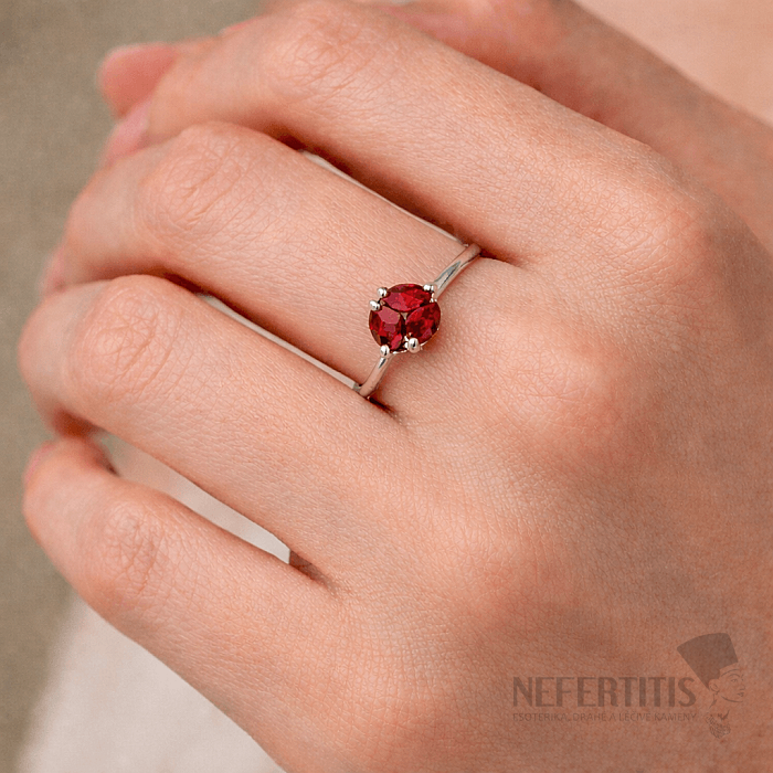 Granát vyniká svojou sýtou červenou až vínovou farbou, ktorá pôsobí luxusne, zmyselne a veľmi elegantne. Tri kamene vytvárajú výrazný, ale stále jemný design, ktorý zaujme na prvý pohľad.