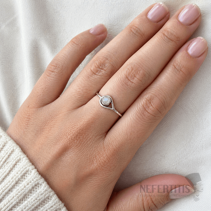 Tento strieborný prsteň s prírodným mesačným kameňom je jemný a elegantný šperk, ktorý dodá každému outfitu magický a nadčasový nádych.