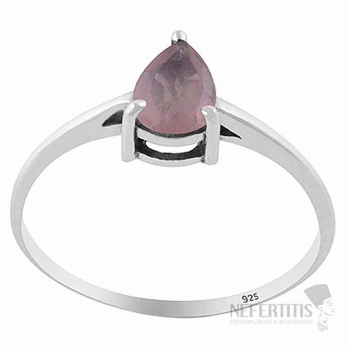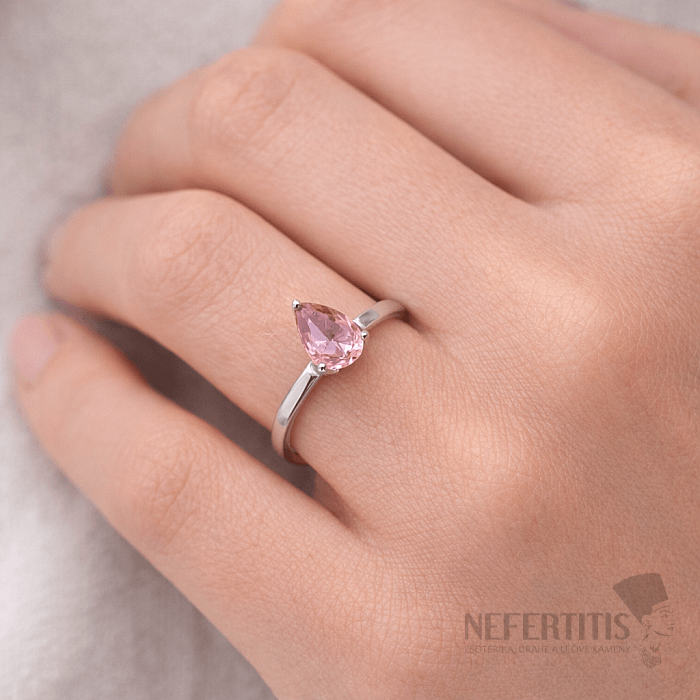 Dominantou prsteňa je prírodný ruženín o veľkosti približne 7 mm, vybrúsený do tvaru kvapky (pear) s precíznym fazetovým brusom , ktorý dodáva kameni jemný ligot a zvýrazňuje jeho nežnú farbu.