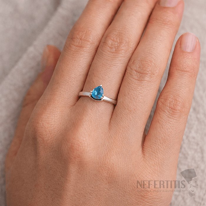Dominantou prsteňa je Swiss Blue topaz o veľkosti cca 6 mm, vybrúsený do tvaru kvapky (pear) s precíznym fazetovým brusom , ktorý maximalizuje jeho ligot a jas.
