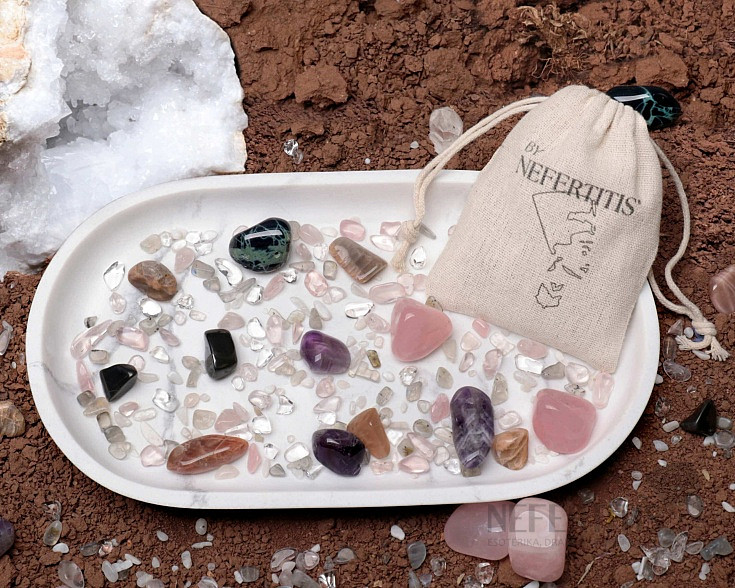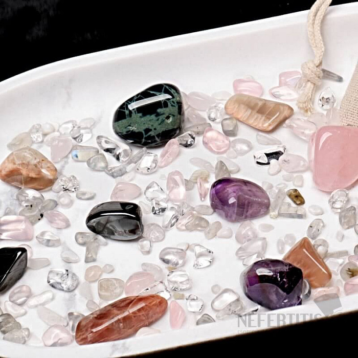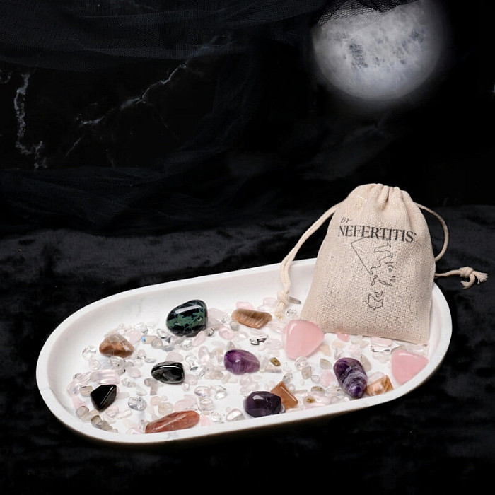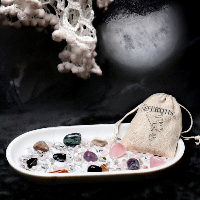 Súprava Drahokamy splnu vznikla v kúzelnej dielni Nefertitis ako harmonická kombinácia minerálov, ktoré tradične podporujú očistu, intuíciu, emočné uvoľnenie a vedomú prácu so zámerom. Spln je v mnohých tradíciách symbolom zavŕšenia cyklu, zosilnenia energie a času, kedy môžeme prepustiť staré a otvoriť sa novému.
