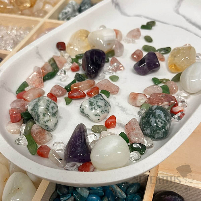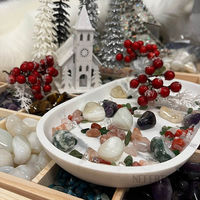 Objavte kúzlo zimnej atmosféry s jedinečnou zmesou Vianočné drahokamy By Nefertitis . Táto harmonická sada ôsmich druhov prírodných kameňov prepája energiu Vianoc, svetla, pokoja a radosti. Drahokamy slúžia ako krásna dekorácia k sviečkam, na vianočný stôl, k betlehému, k vetvičkám alebo ako detail k fotografiám a darčekovému baleniu . Kamene sú v bavlnenom sáčku s nápisom a logom Nefertitis. Ilustratívne vyobrazenie - každé vrecko má originálny obsah prírodných kameňov, ale v každom nájdete rovnaký počet veľkých kameňov, ako je na obrázku.