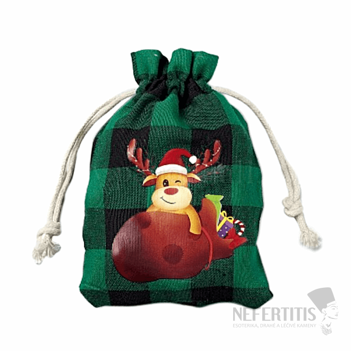 Jutový tartanový sáčok Vianočný sob so sťahovacou šnúrkou na úschovu drobných cenností, kamienkov, šperkov a na atraktívne zabalenie a darčekov pre tých, ktorých máte radi. Práve darčekové vrecká a vačky sú jednoduchou a lacnou alternatívou darčekových krabičiek. Doprajte svojim obľúbeným drobnostiam, šperkom či kamienkom pohodlie a ochranu vo vnútri tohto vrecka. Ilustratívne vyobrazenie.