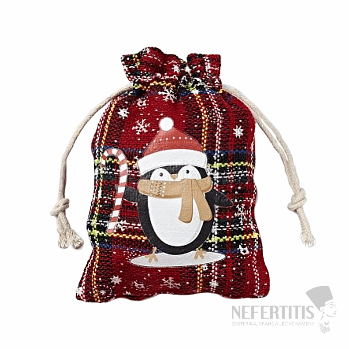 Jutové tartanový sáčok Vianočný tučniak so sťahovacou šnúrkou na úschovu drobných cenností, kamienkov, šperkov a na atraktívne zabalenie a darčekov pre tých, ktorých máte radi. Práve darčekové vrecká a vačky sú jednoduchou a lacnou alternatívou darčekových krabičiek. Doprajte svojim obľúbeným drobnostiam, šperkom či kamienkom pohodlie a ochranu vo vnútri tohto vrecka. Ilustratívne vyobrazenie.