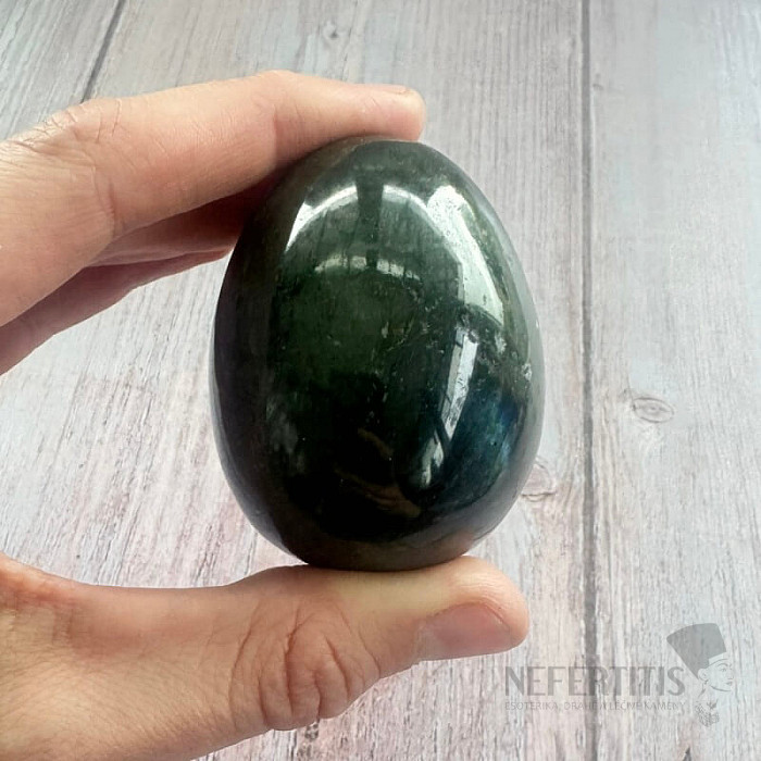 Krásne vajíčko vybrúsené z labradoritu. Veľkosť cca 5,1 x 6,4 cm (šírka x výška), 237 g.