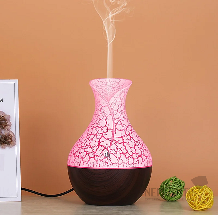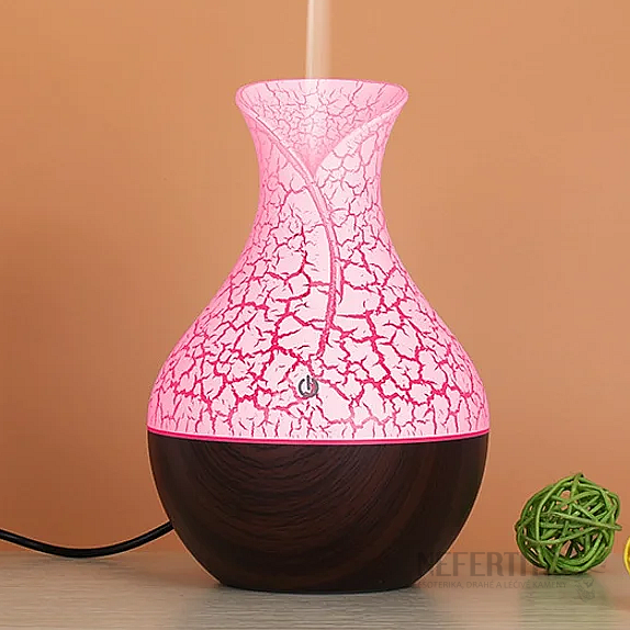 Difúzer v tvare vázy prináša do interiéru elegantný prírodný prvok . Spodná časť s dekórom tmavého dreva pôsobí luxusne, zatiaľ čo horná „lávová“ textúra podsvietená meniacim sa svetlom vytvára efektnú hru farieb.