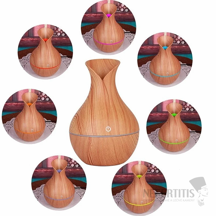 Difúzer svojim tvarom pripomína elegantnú vázu a jeho svetlý drevodekor dodáva interiéru teplo a harmóniu. Farebné LED podsvietenie jemne presväcuje telo prístroja a prináša príjemné svetelné efekty pre relaxáciu aj spánok.