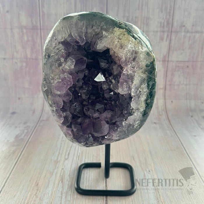 Ametystová drôza kvality A na kovovom stojane.