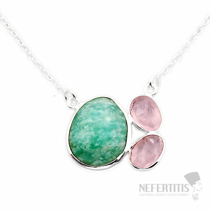 Unikátny strieborný náhrdelník s brúseným amazonitom a ruženiny. Amazonit zeleno-modrým odtieňom svojej farby takmer prekonáva krásu farby prírodných tyrkysov. Pri pohľade na tento náhrdelník sa zasnívate a prenesiete sa niekam k moru, do zátoky s tyrkysovo modrou a zelenou vodou, zaliatu slnkom letného dňa. Ag 925. Kupujete priamo vyobrazený šperk.