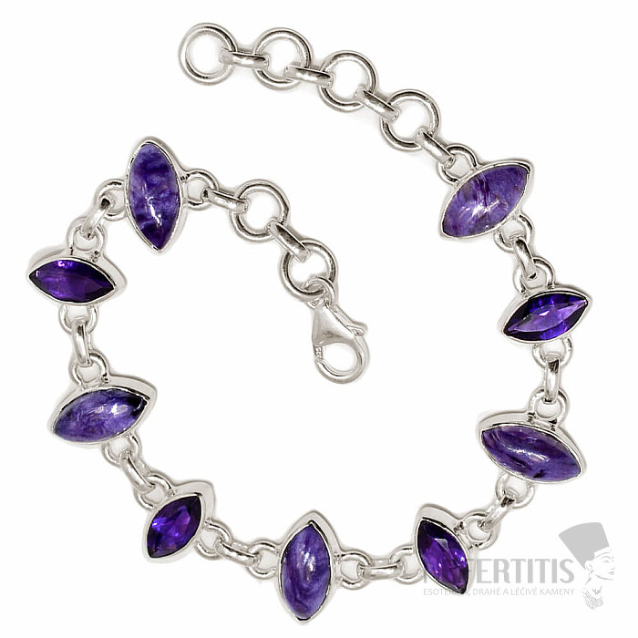 Strieborný náramok s čaroitmi krásnej kvality a brúsenými ametystmi. Nádherne fialovo sfarbené čaroity vás okúzlia nielen svojim hodvábnym leskom, ale aj premenou kresby v meniacom sa svetle. Ag 925. Kupujete priamo vyobrazený šperk.