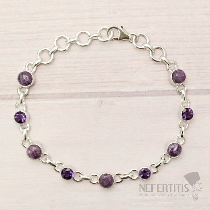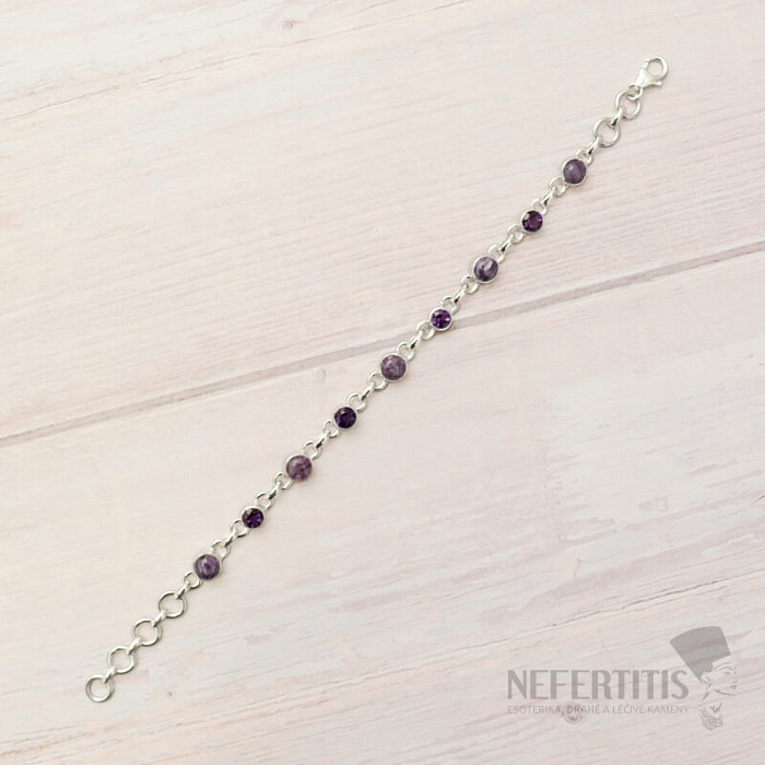 Strieborný náramok s čaroitmi krásnej kvality a brúsenými ametystmi. Nádherne fialovo sfarbené čaroity vás okúzlia nielen svojim hodvábnym leskom, ale aj premenou kresby v meniacom sa svetle. Ag 925. Kupujete priamo vyobrazený šperk.