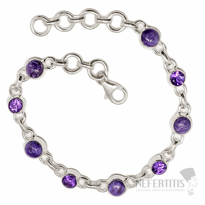 Strieborný náramok s čaroitmi krásnej kvality a brúsenými ametystmi. Nádherne fialovo sfarbené čaroity vás okúzlia nielen svojim hodvábnym leskom, ale aj premenou kresby v meniacom sa svetle. Ag 925. Kupujete priamo vyobrazený šperk.