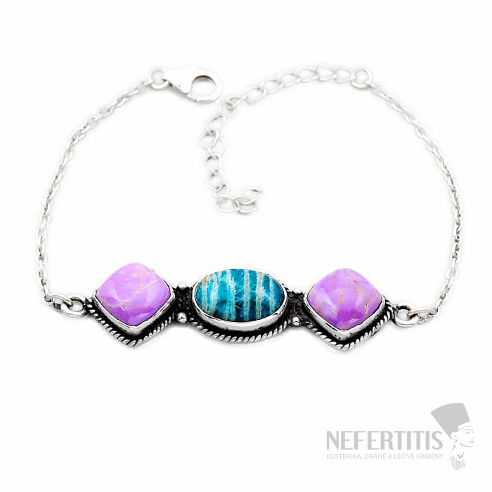 Pôbavný strieborný náramok s fosfosiderity a amazonitom. Ag 925. Fosfosiderit je talizmanom používaným na podporenie túžby nájsť spôsob, ako zmeniť časť života do vytúženého stavu. Fialová je farbou intuície, snov a luxusu. Krásne vyfarbený kameň bude ozdobou na rôzne príležitosti. Kupujete priamo vyobrazený šperk.