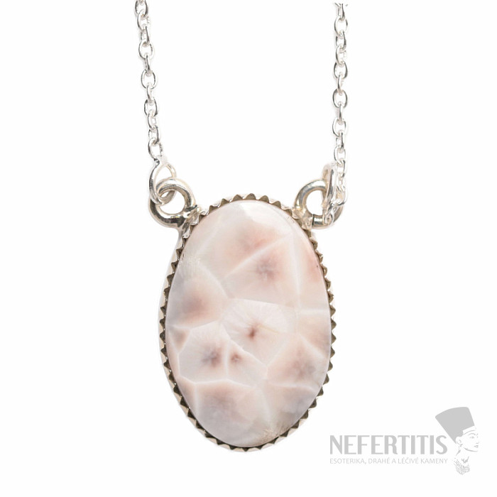 Strieborný náhrdelník s natrolitom. Ag 925. Natrolit je kameňom osobného rastu, rezonuje s korunnou čakrou a čakrou Tretieho oka, tým podporuje komunikáciu a sústredenie. Kupujete priamo vyobrazený šperk.
