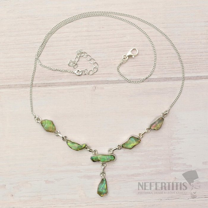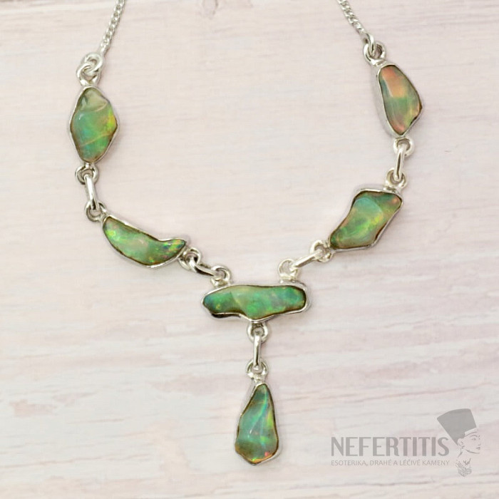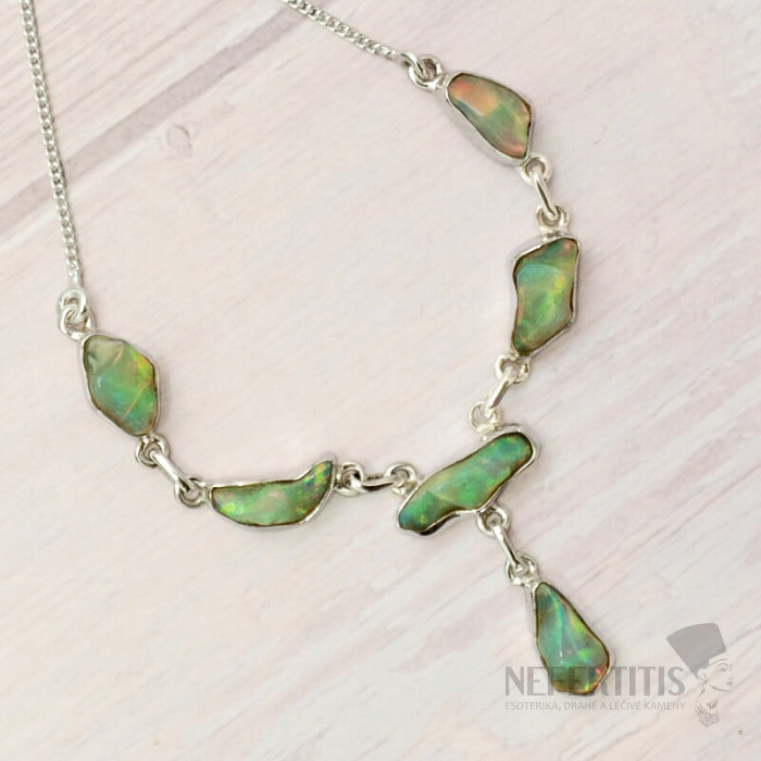 Moderný a elegantný strieborný náhrdelník zo surového, zalešteného opálu, s krásnou hrou farieb - Ag 925. Pôsobivý a elegantný šperk, od pohľadu navodzujúci radosť a pocity harmónie. Etiópske opály oproti austrálskym opálom doslova hýria až neónovo žiarivými odleskami farieb. Hoci na prvý pohľad na to nevyzerajú, ohňostroj farieb, ktorý z opálov v tomto náhrdelníku vytryskne pri každom dopade svetla, očarí nielen vás, ale celé vaše okolie. Kupujete priamo vyobrazený šperk.