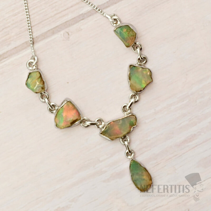 Moderný a elegantný strieborný náhrdelník zo surového, zalešteného opálu, s krásnou hrou farieb - Ag 925. Pôsobivý a elegantný šperk, od pohľadu navodzujúci radosť a pocity harmónie. Etiópske opály oproti austrálskym opálom doslova hýria až neónovo žiarivými odleskami farieb. Hoci na prvý pohľad na to nevyzerajú, ohňostroj farieb, ktorý z opálov v tomto náhrdelníku vytryskne pri každom dopade svetla, očarí nielen vás, ale celé vaše okolie. Kupujete priamo vyobrazený šperk.
