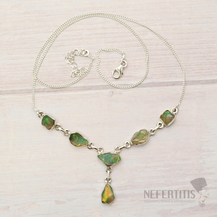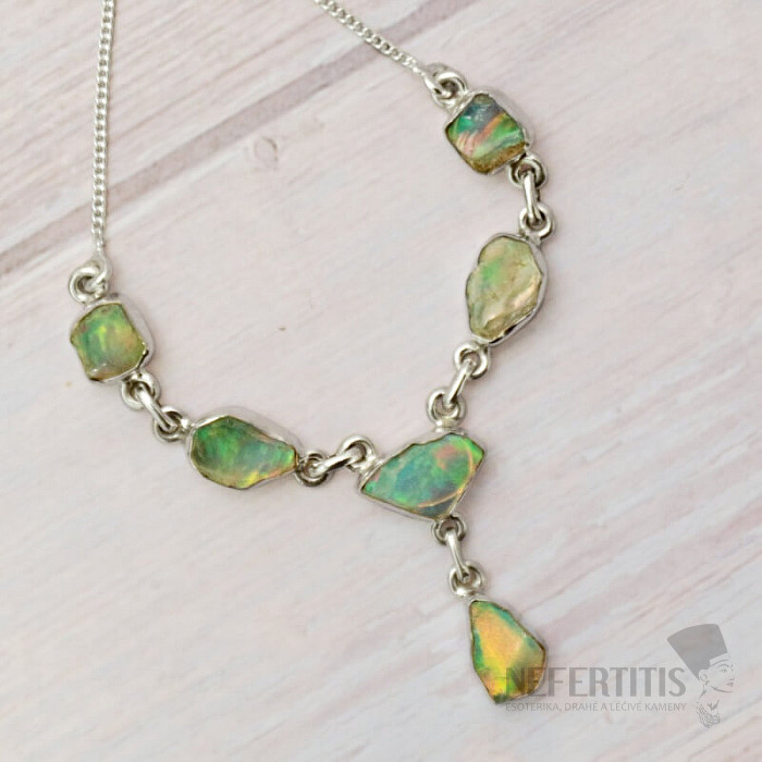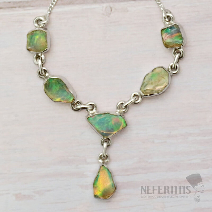 Moderný a elegantný strieborný náhrdelník zo surového, zalešteného opálu, s krásnou hrou farieb - Ag 925. Pôsobivý a elegantný šperk, od pohľadu navodzujúci radosť a pocity harmónie. Etiópske opály oproti austrálskym opálom doslova hýria až neónovo žiarivými odleskami farieb. Hoci na prvý pohľad na to nevyzerajú, ohňostroj farieb, ktorý z opálov v tomto náhrdelníku vytryskne pri každom dopade svetla, očarí nielen vás, ale celé vaše okolie. Kupujete priamo vyobrazený šperk.