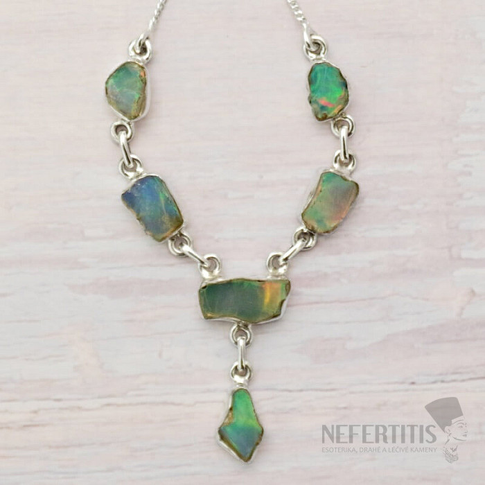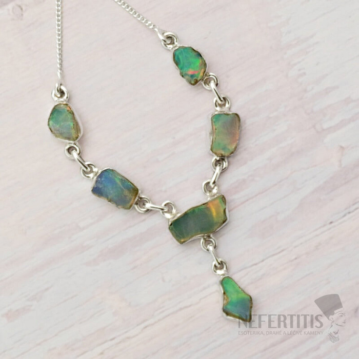 Moderný a elegantný strieborný náhrdelník zo surového, zalešteného opálu, s krásnou hrou farieb - Ag 925. Pôsobivý a elegantný šperk, od pohľadu navodzujúci radosť a pocity harmónie. Etiópske opály oproti austrálskym opálom doslova hýria až neónovo žiarivými odleskami farieb. Hoci na prvý pohľad na to nevyzerajú, ohňostroj farieb, ktorý z opálov v tomto náhrdelníku vytryskne pri každom dopade svetla, očarí nielen vás, ale celé vaše okolie. Kupujete priamo vyobrazený šperk.