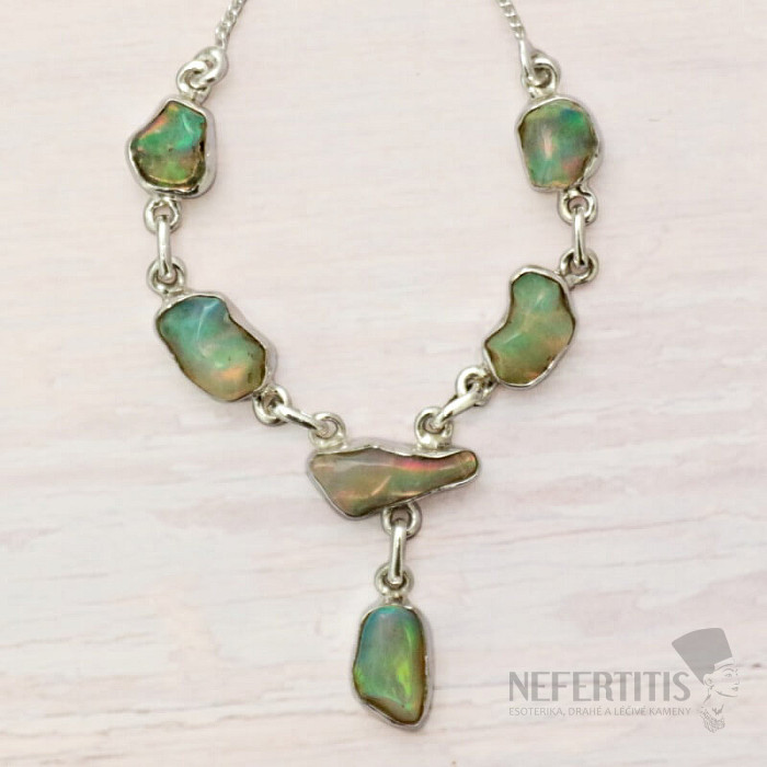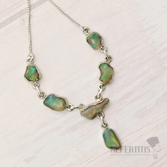 Moderný a elegantný strieborný náhrdelník zo surového, zalešteného opálu, s krásnou hrou farieb - Ag 925. Pôsobivý a elegantný šperk, od pohľadu navodzujúci radosť a pocity harmónie. Etiópske opály oproti austrálskym opálom doslova hýria až neónovo žiarivými odleskami farieb. Hoci na prvý pohľad na to nevyzerajú, ohňostroj farieb, ktorý z opálov v tomto náhrdelníku vytryskne pri každom dopade svetla, očarí nielen vás, ale celé vaše okolie. Kupujete priamo vyobrazený šperk.