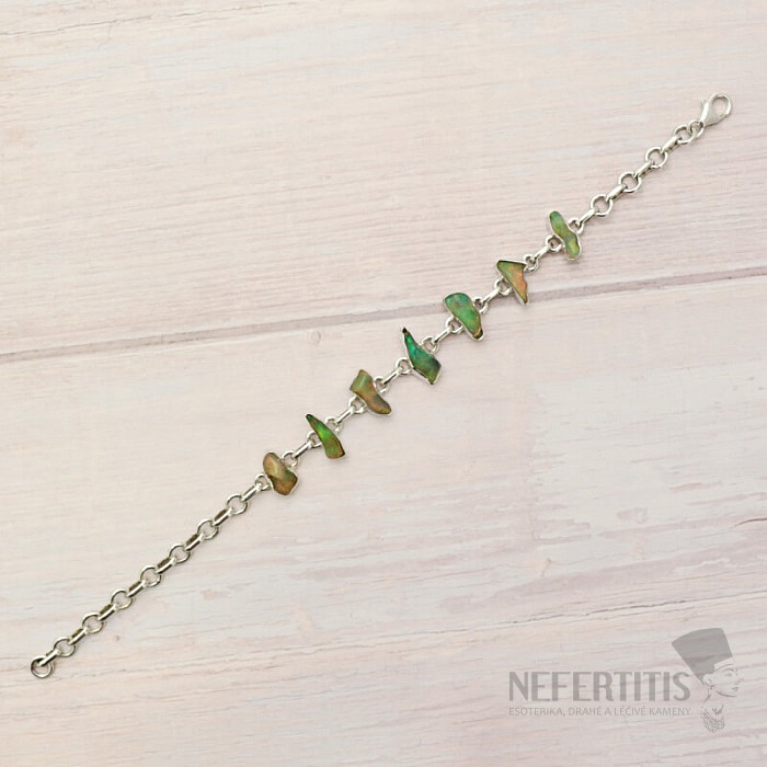 Nádherný a elegantný náramok zo surového, zalešteného opálu. Pôsobivý a elegantný šperk, od pohľadu navodzujúci radosť a pocity harmónie. Etiópske opály oproti austrálskym opálom doslova hýria až neónovo žiarivými odleskami farieb. Hoci na prvý pohľad na to nevyzerajú, ohňostroj farieb, ktorý z opálov v tomto náramku vytryskne pri každom pohybe vašej ruky, očarí nielen vás, ale celé vaše okolie. Etiópske opály majú pod rôznymi uhlami dopadu svetla rôznu farbu, sú to takí "kamienkoví chameleóni". Striebro Ag 925. Kupujete priamo vyobrazený šperk.