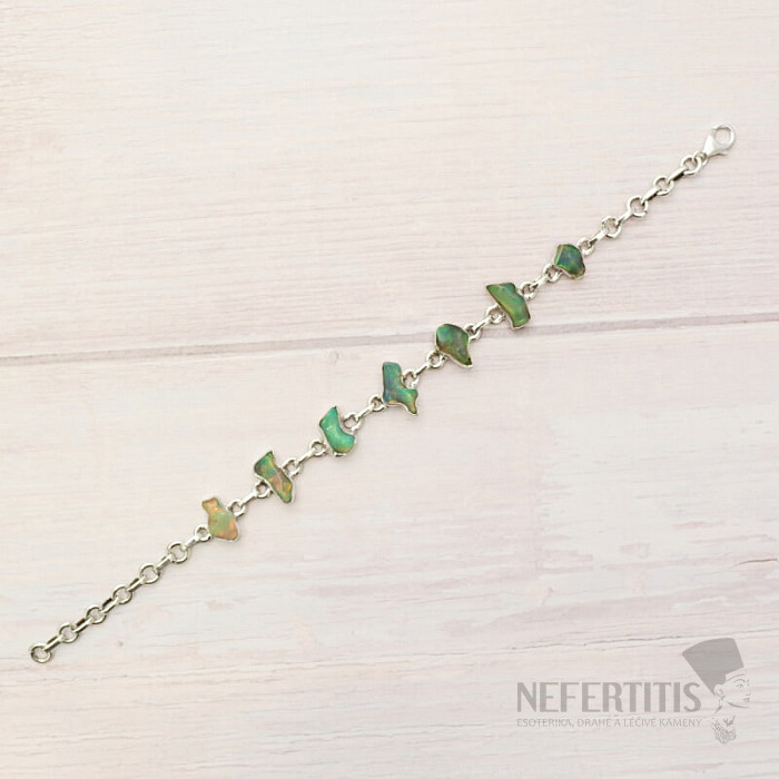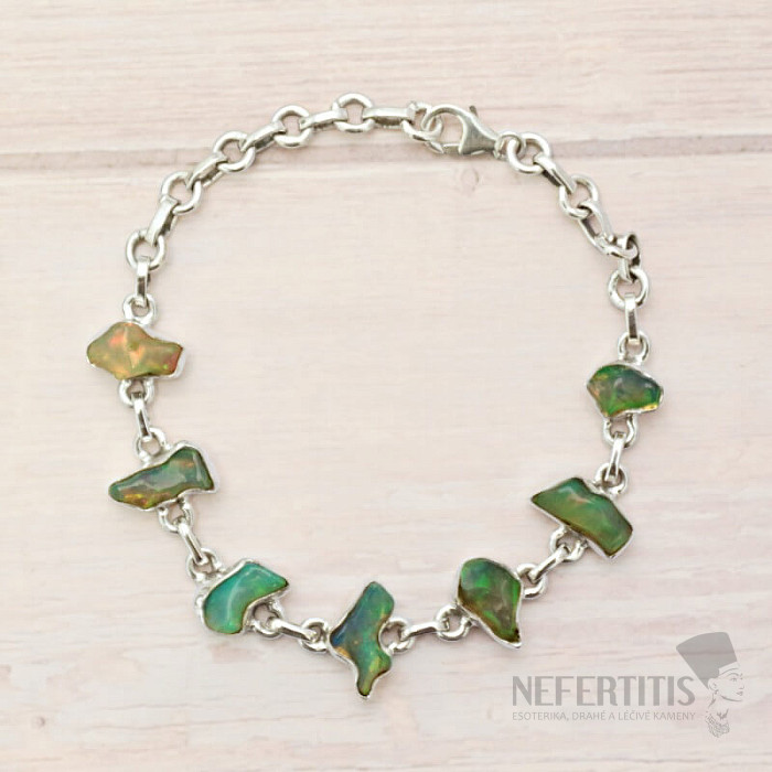 Nádherný a elegantný náramok zo surového, zalešteného opálu. Pôsobivý a elegantný šperk, od pohľadu navodzujúci radosť a pocity harmónie. Etiópske opály oproti austrálskym opálom doslova hýria až neónovo žiarivými odleskami farieb. Hoci na prvý pohľad na to nevyzerajú, ohňostroj farieb, ktorý z opálov v tomto náramku vytryskne pri každom pohybe vašej ruky, očarí nielen vás, ale celé vaše okolie. Etiópske opály majú pod rôznymi uhlami dopadu svetla rôznu farbu, sú to takí "kamienkoví chameleóni". Striebro Ag 925. Kupujete priamo vyobrazený šperk.