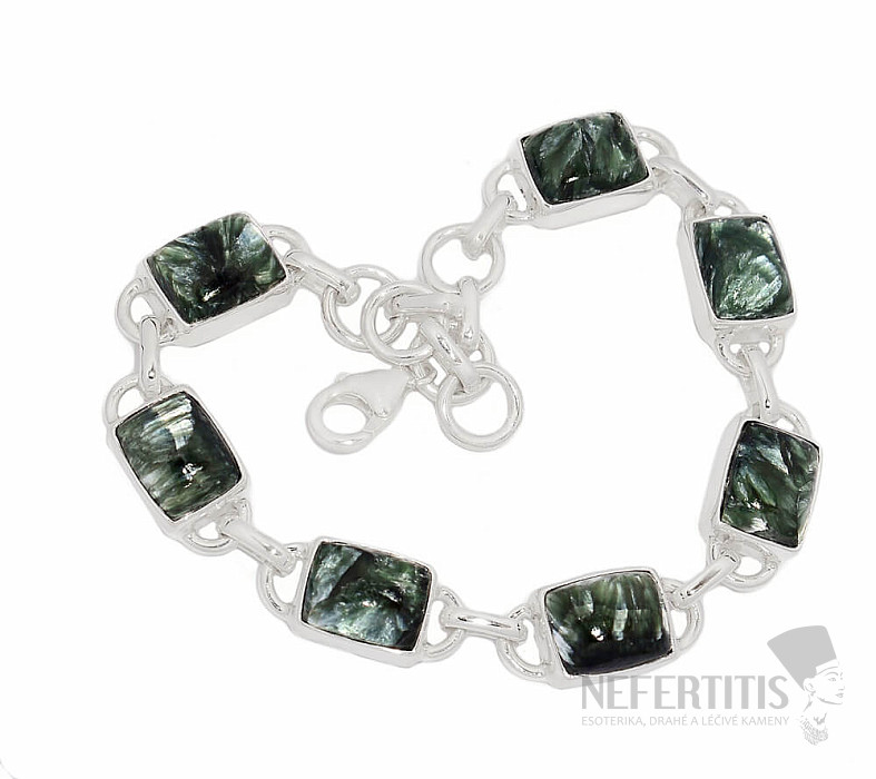 Nádherný náramok so starostlivo vybranými kameňmi zeleného serafinitu. Krásne prefarbený serafinit, zasadený do striebra, okúzľuje na prvý pohľad veľmi peknú kresbou „anjelských pierok“ v zelených kameňoch. Veľmi elegantný a pohľadný šperk, vyžarujúci milú a láskyplnú, doslova anjelskú, energiu. Ag 925. Kupujete priamo vyobrazený šperk.