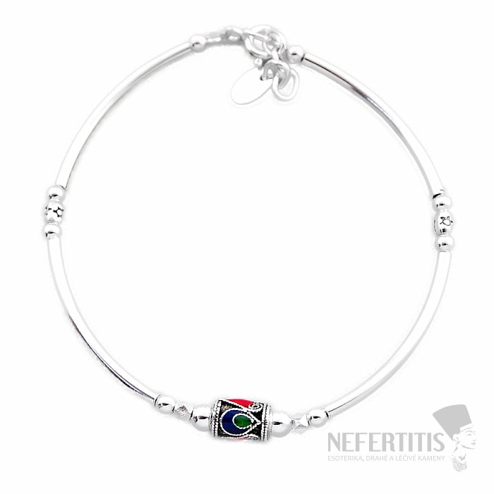 Strieborný náramok so smaltom. Ag 925. Veľkosť: dĺžka náramku je cca 18 cm, je možné zapnúť až na 19,5 cm. Veľkosť smaltovej korálky cca 0,5x0,7 cm.