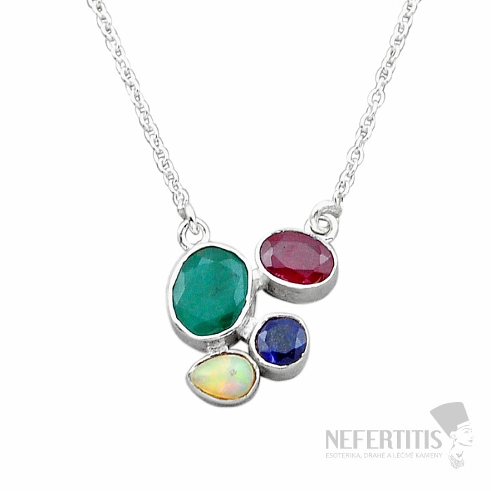Strieborný náhrdelník s brúseným indickým smaragdom, rubínom, zafírom akabošonom etiópskeho opalu. Ag 925.
