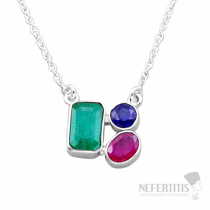 Strieborný náhrdelník s brúseným indickým smaragdom, rubínom a zafírom. Ag 925.