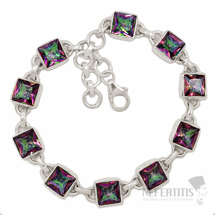 Veľmi atraktívnou a nádhernou dúhou farieb sa trblietajúci strieborný náramok osadený brúsenými mystickými topazmi. Ag 925. Hra farieb na hranách mystických topazov sa mení podľa svetla a naklonenia kameňa, čím sa striedajú prevládajúce farebné tóny, napr. fialovo-zelené, fialovo-žlté, modré. Tvar kameňov a ich tzv. oválny diamantový brús dáva vyniknúť dúhovým meniacim farbám, ktoré právom robia z tohto náramku nevšedný šperk, pôsobiaci až mystickým dojmom. Kupujete priamo vyobrazený šperk.