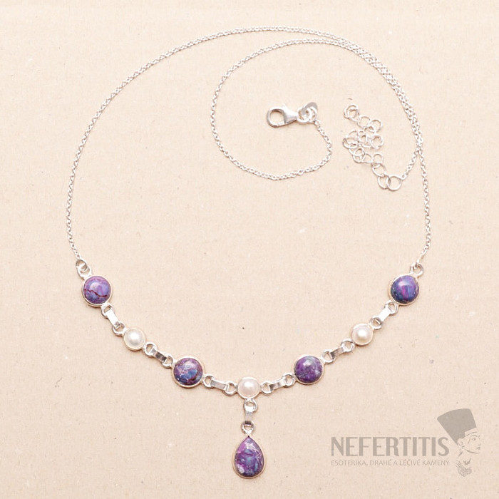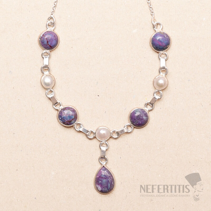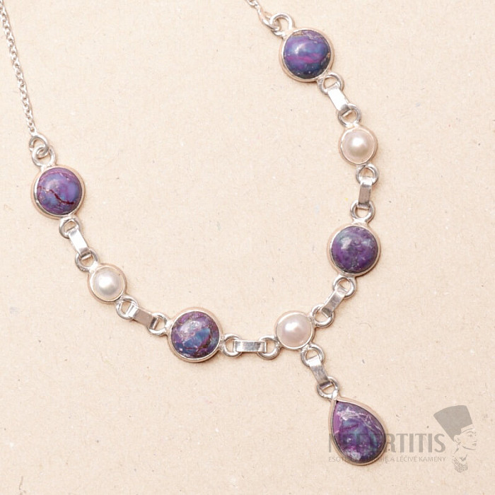 Výnimočný náhrdelník zo striebra s kabošonmi z kúskov purpurového tyrkysu , spájaného meďou do pôsobivých kabošonov krásnej purpurovo-fialovej farby. Tejto farby je docielené dofarbovaním kameňa. Tento typ šperkov získava vo svete na veľkej obľube z dôvodu stále rastúcej ceny jednoliatych kusov prírodného tyrkysu. Tyrkys je doplnený o biele perly . Výrazný šperk, ktorý každého očarí a nikto ho na vás neprehliadne. Ag 925. Kupujete priamo vyobrazený šperk.