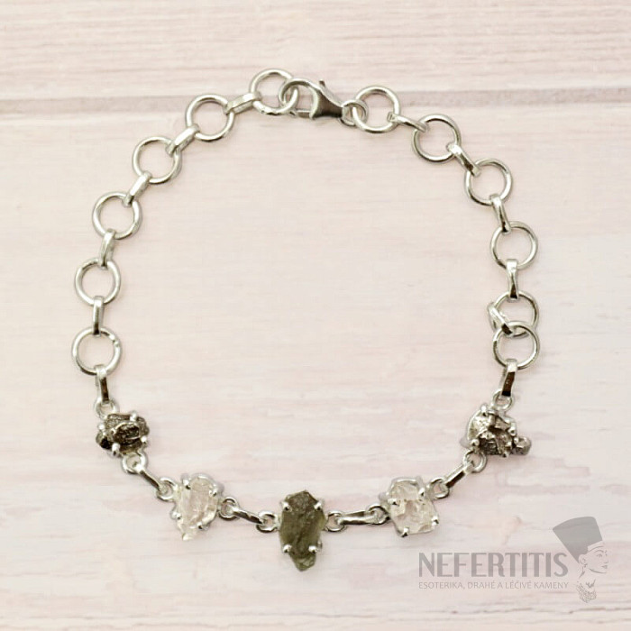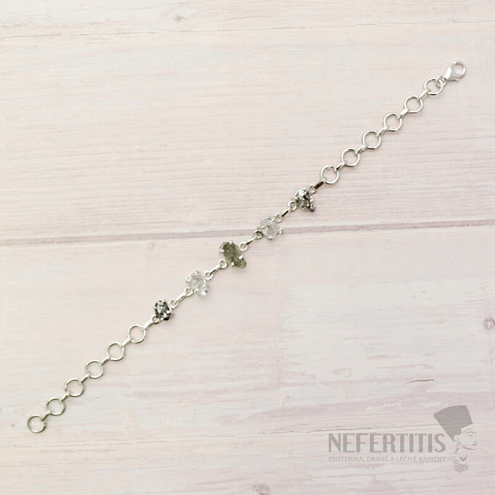 Vltavín, Herkimer diamant a meteorit Campo del Cielo náramok striebro Ag 925 LOT36