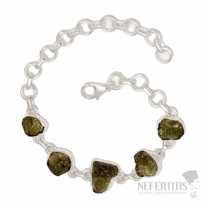 Atraktívny strieborný náramok s vltavínami. Ag 925. Kupujete priamo vyobrazený šperk. Veľkosť náramku: dĺžka 12,5 cm, je možné dopnúť až na 19,5 cm. Veľkosť vltavínov cca 1,2 cm. Vltavín (Moldavit) je sklo tektického… viac »