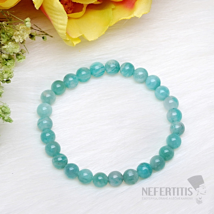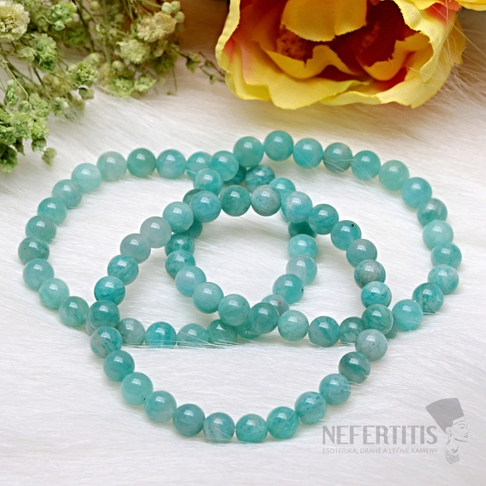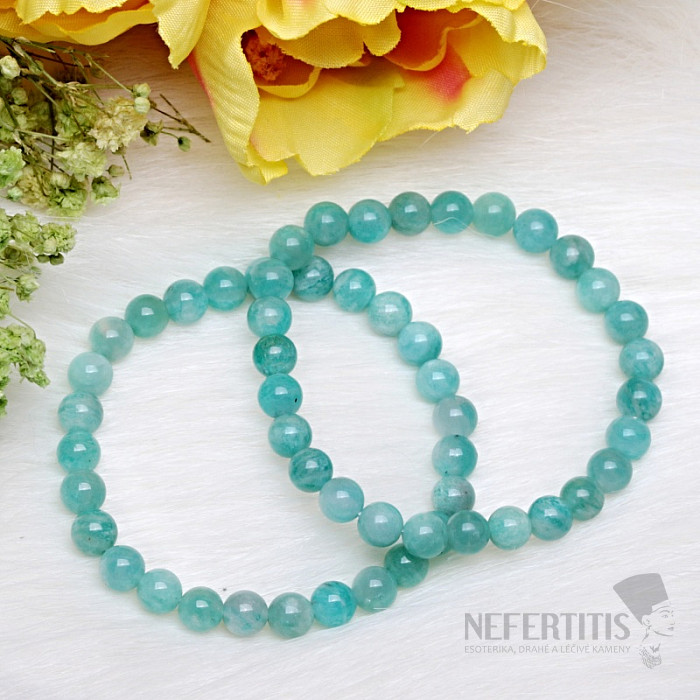 Korálky z amazonitu A kvality vynikajú peknou farbou a prirodzeným leskom. Náramok je navlečený na pružnej gumičke, vďaka ktorej sa pohodlne prispôsobí detskému zápästiu a ľahko sa nasadzuje aj dáva dole.