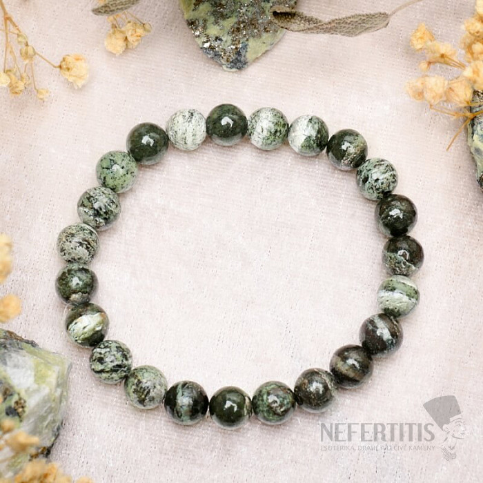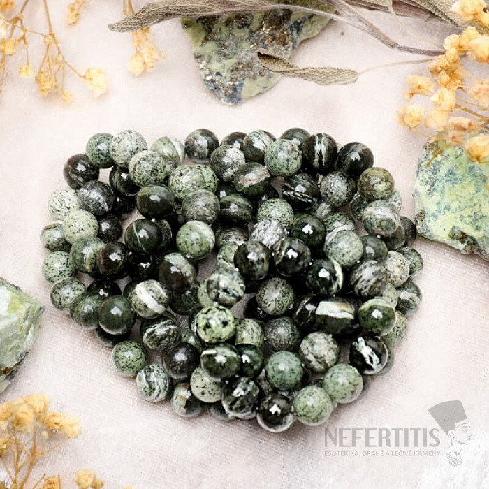 Unisex náramok z korálok z chryzotilu zaujme svojim prirodzeným zeleným odtieňom a jemnou kresbou minerálu. Minimalistické prevedenie sa ľahko kombinuje s každodenným aj elegantnejším outfitom. Vďaka univerzálnemu dizajnu je vhodný pre mužov aj ženy a stane sa nadčasovým doplnkom vašej zbierky šperkov.