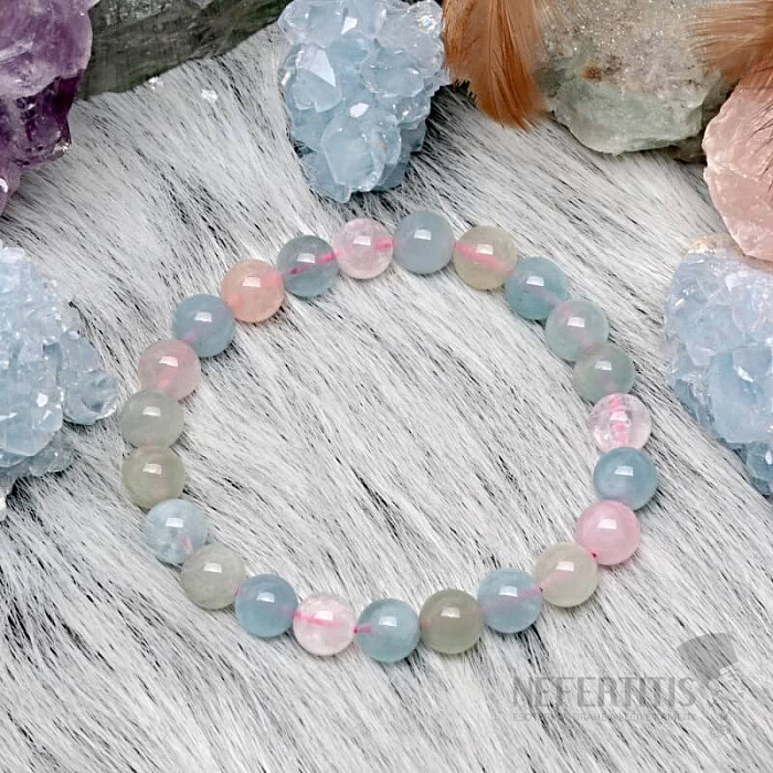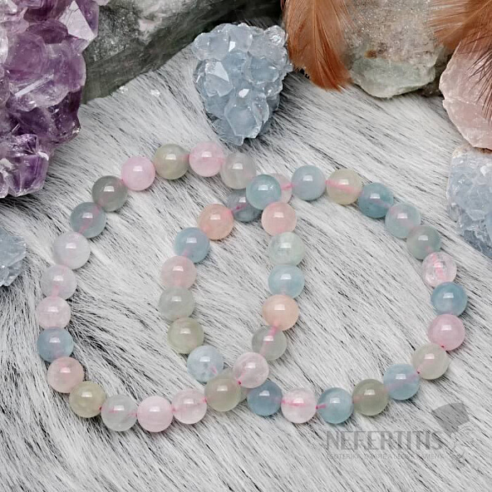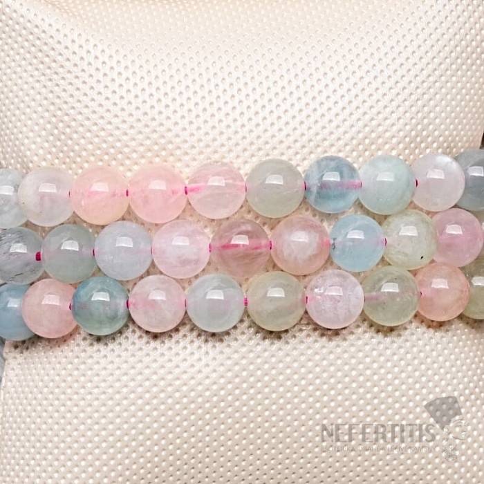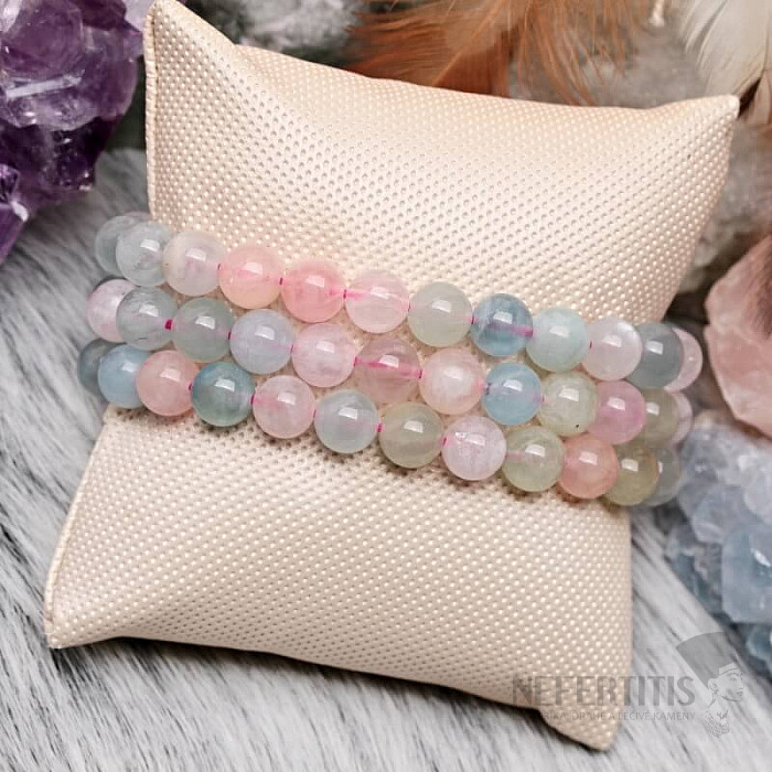 Nežný náramok z korálok prírodného vzácneho morganitu , zvaného tiež ružový smaragd, prináša lásku, spolupatričnosť a vzájomné pochopenie medzi partnermi. Je kameňom božskej lásky. Morganit je osobným kameňom ľudí narodených v znamení Váhy. Korálky morganitu cca 8 mm sú navlečené na kvalitnej nylonovej gumičke farby.