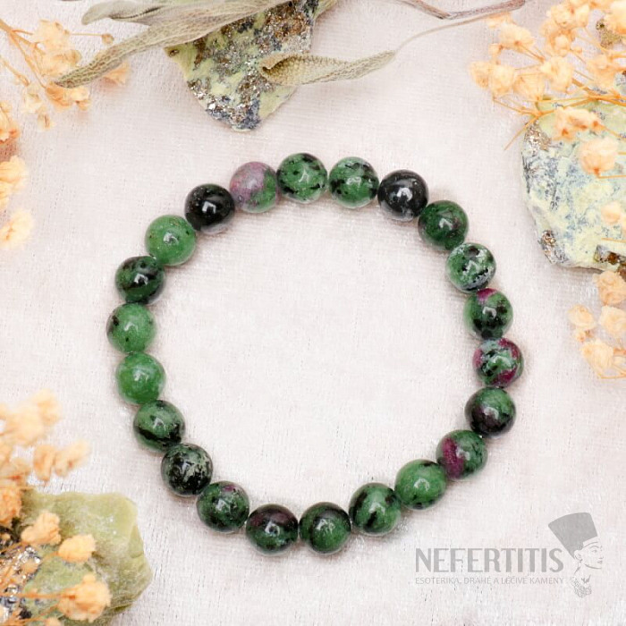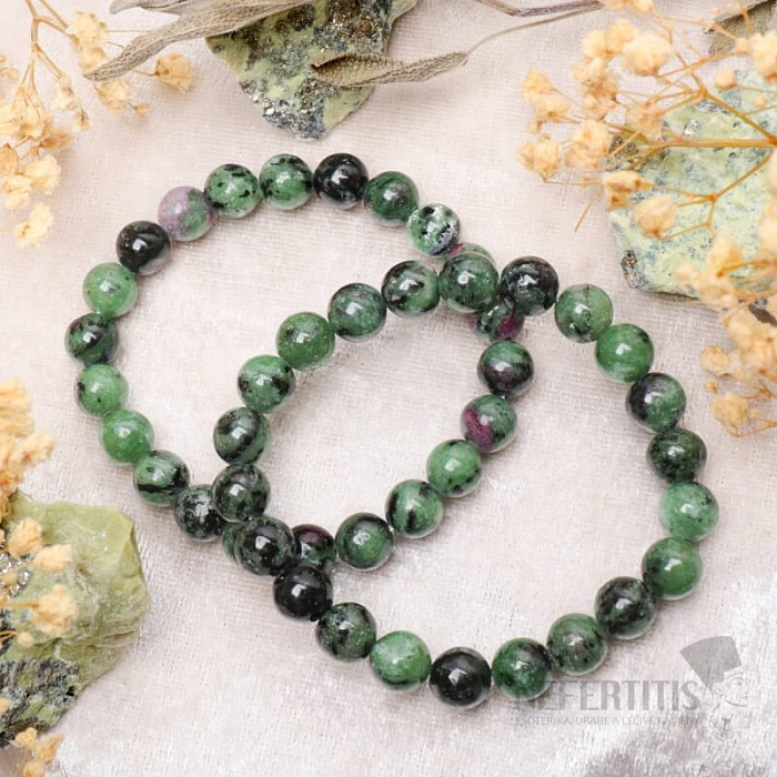 Elegantný náramok z prírodného rubínu v zoisite zaujme jedinečnou kombináciou zelených a ružovo-červených tónov. Každá korálka o veľkosti 8 mm je originál, vďaka čomu je každý náramok úplne jedinečný.