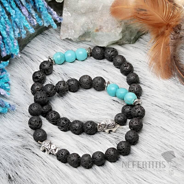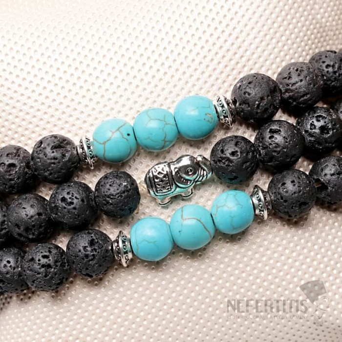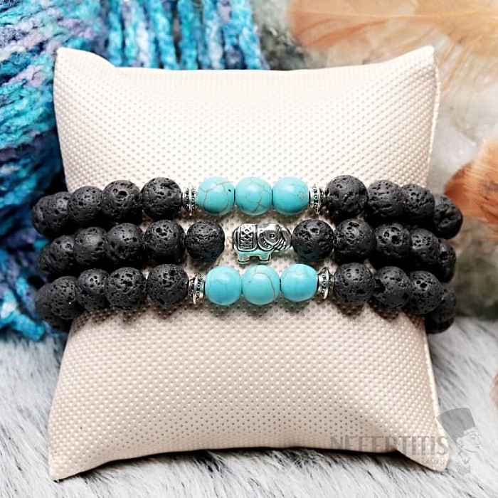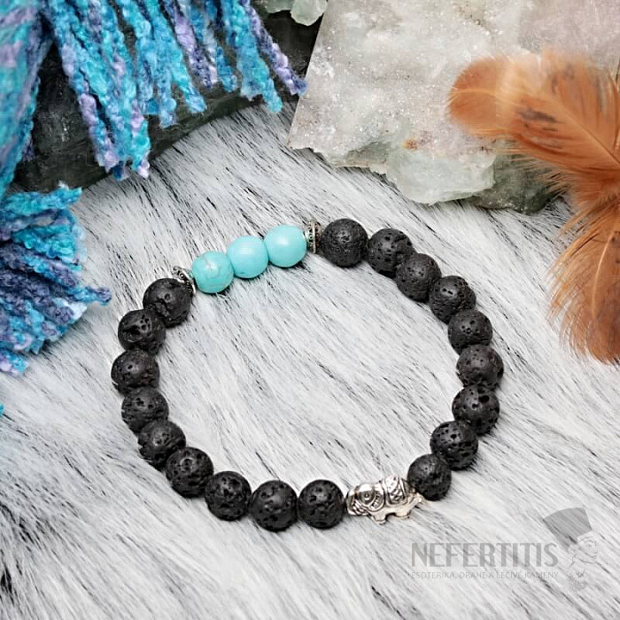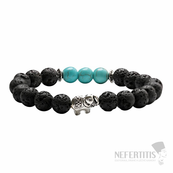 Krásny náramok z korálikov tyrkenit - rekonštruovaného tyrkysu. Korálky tyrkenit sú od lávových korálok oděleny kovovú aplikácií. V náramku je vložený kovový korálku z obyčajného kovu v tvare slona, ktorý je symbolom krásy, tiché sily, majestátnosti a láskavosti. Korálky sú navlečené na nylové gumičke neutrálne farby. Priemer korálikov cca 8 mm. Ilustratívne vyobrazenie.