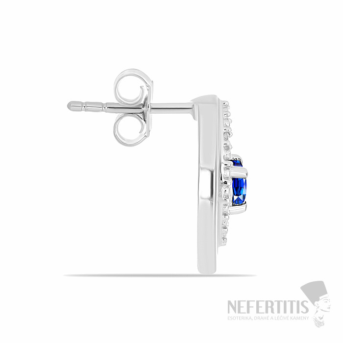 Exkluzívne strieborné náušnice dizajnového radu Nefertitis Collection s prírodnými brúsenými modrými zafírmi. Zafíry sú doplnené kubickými zirkónmi pre neprehliadnuteľný trblietavý lesk. Kamene sú zasadené do rhodiovaného striebra , ktorého povrch pripomína vzhľad bieleho zlata, náušnice tak pôsobia luxusným dojmom. Rhodiované striebro je menej náchylné na oxidáciu (černanie) povrchu. Krásny trblietavý šperk s čírym kameňom klenotníckej kvality, ktorého krása je zdôraznená dopadom svetla na jednotlivé plôšky výbrusu, vhodný na rôzne príležitosti. Rhodiované striebro Ag 925/1000. Uvedená váha je celého páru. Veľkosť zafíru 4 mm. Ilustratívne vyobrazenie.